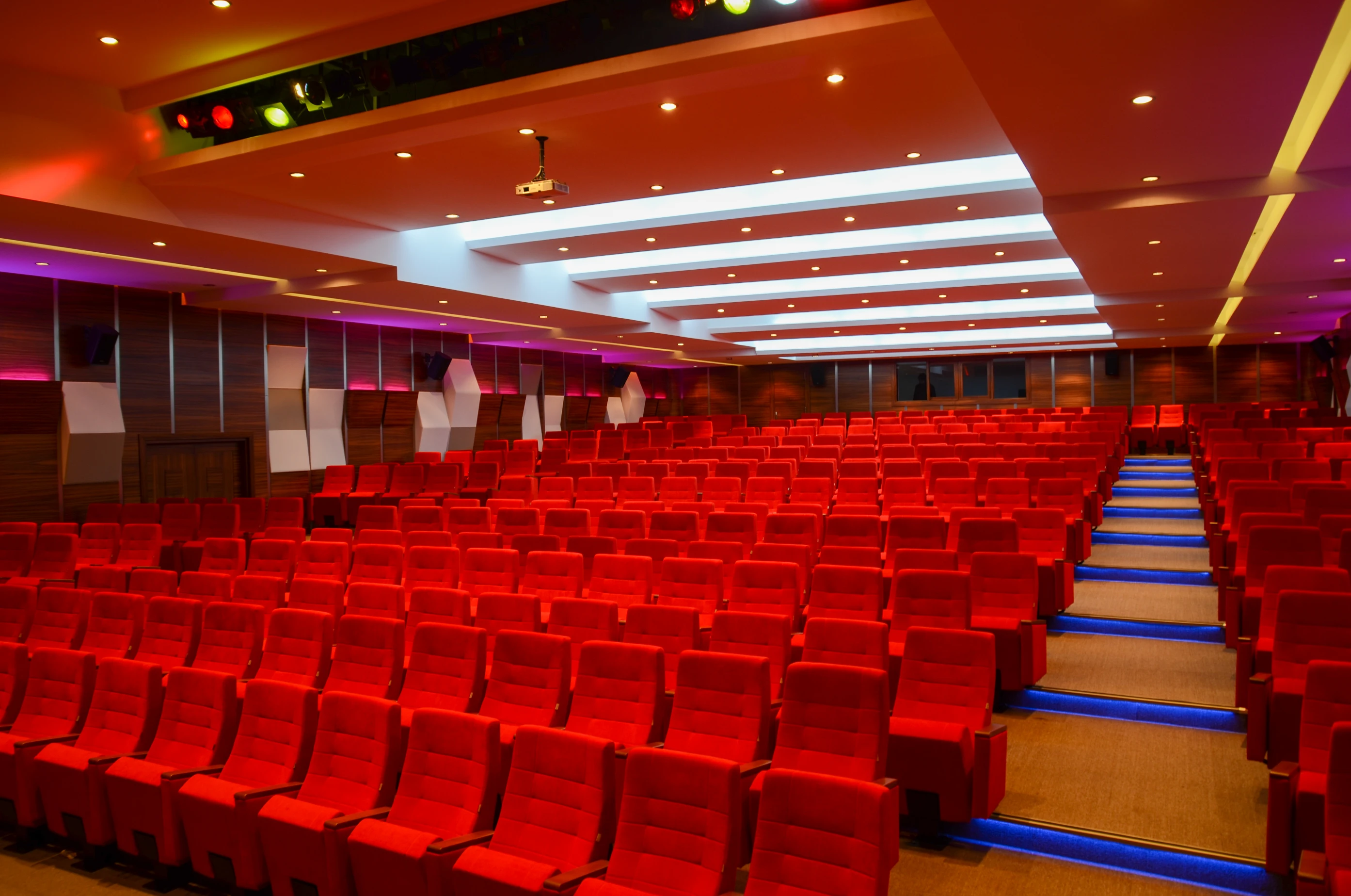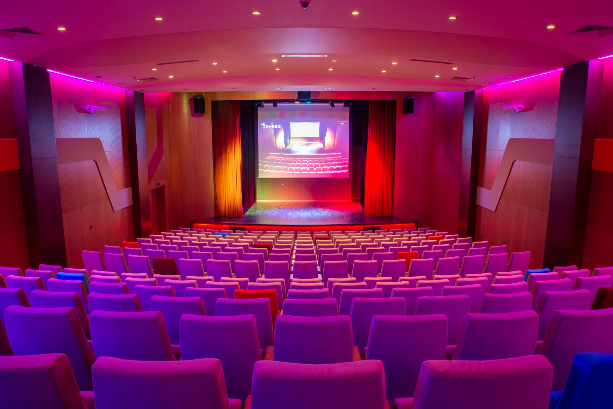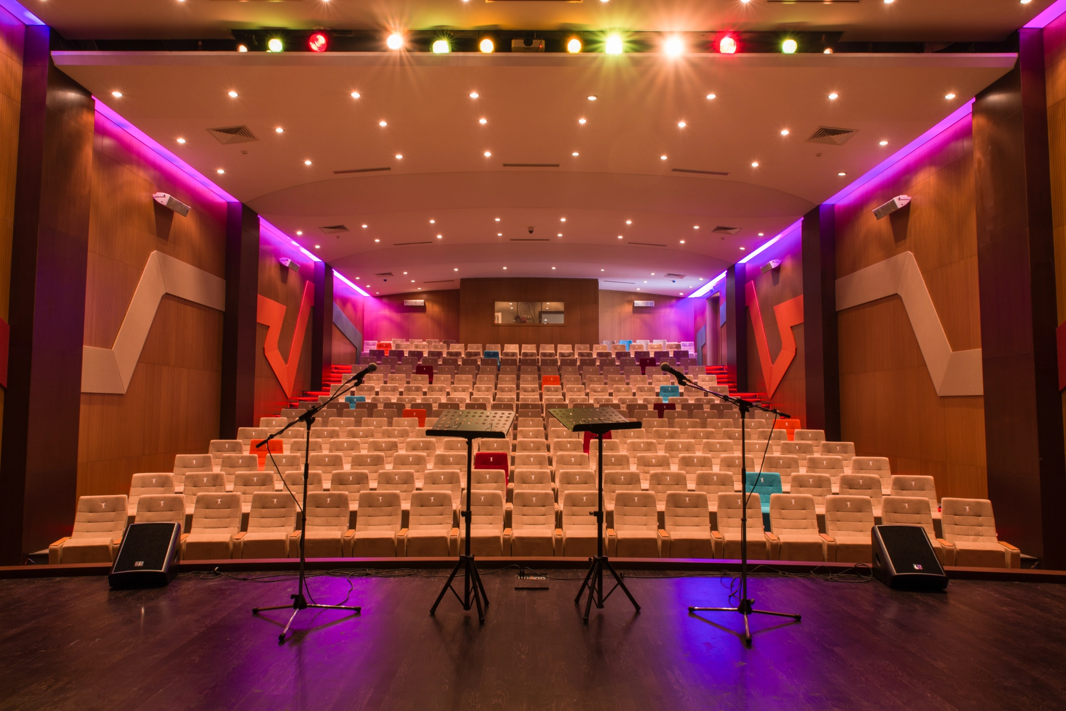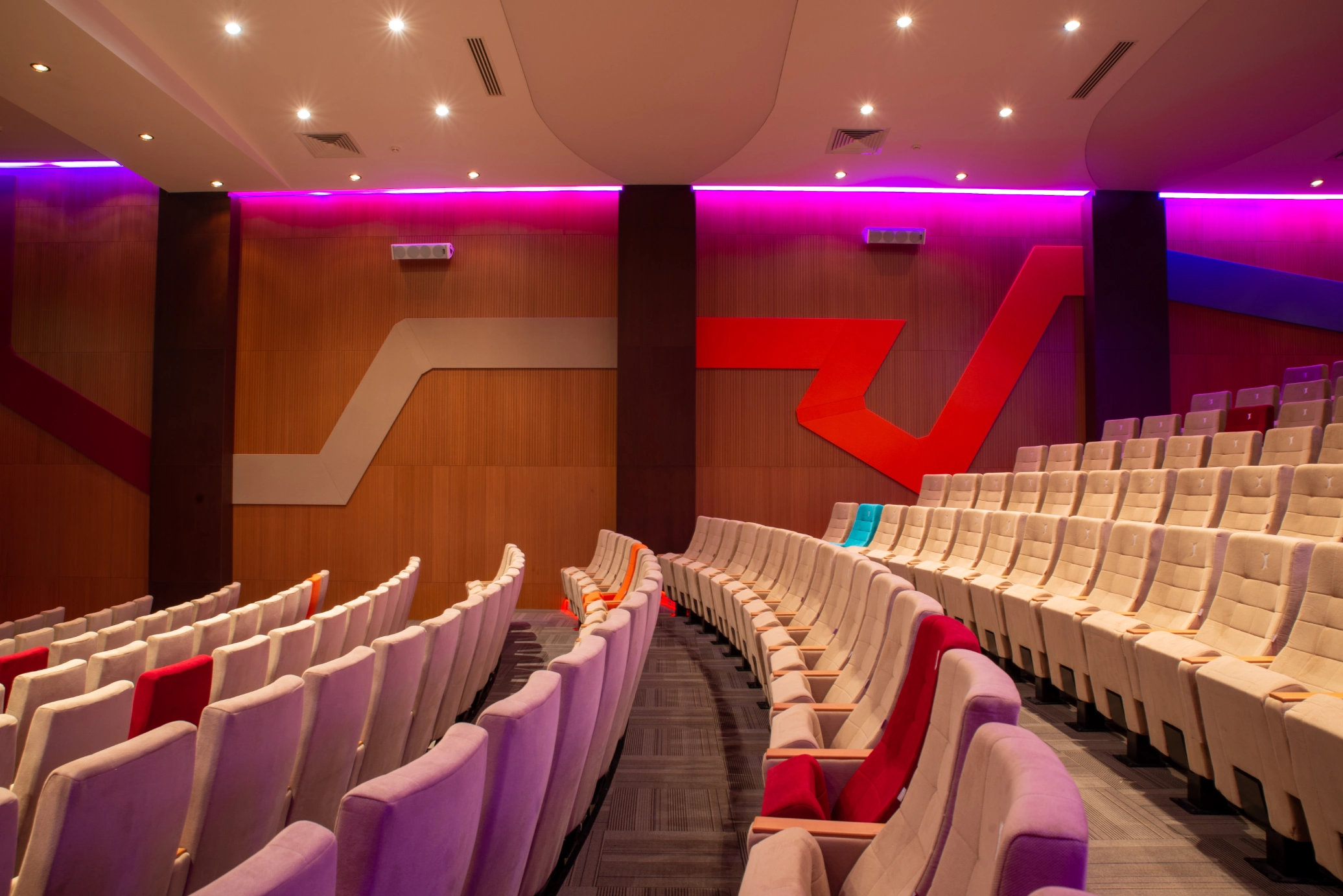 A 369-seat auditorium distinguished by its striking red palette and refined detailing. Custom acoustic panels with vertical wooden slats form a unique wall pattern, highlighted by concealed LED lighting that enhances depth and texture in dimmed settings. The hall integrates architectural precision with stage mechanics and professional AV systems, achieving both visual character and balanced acoustic performance.