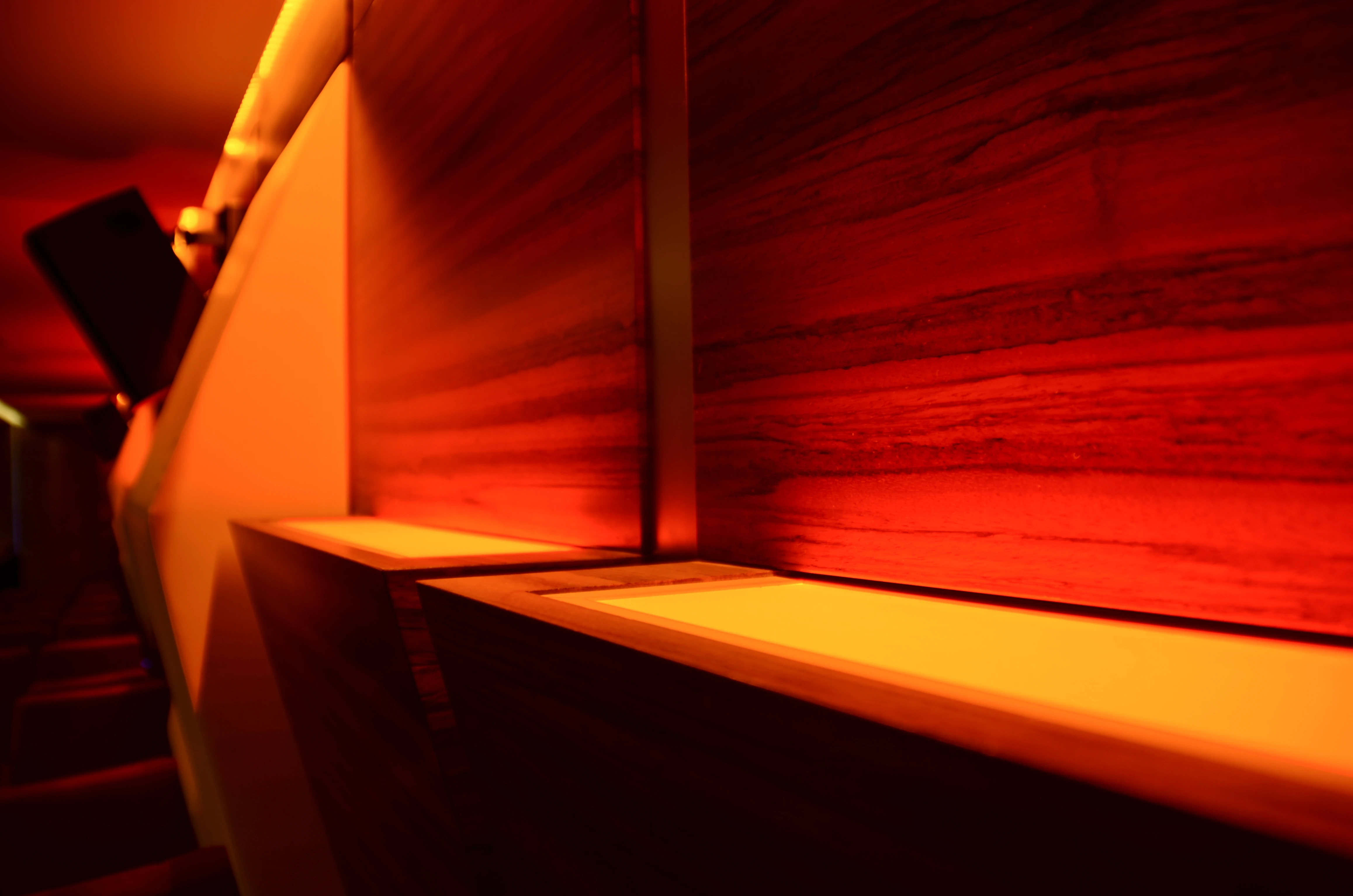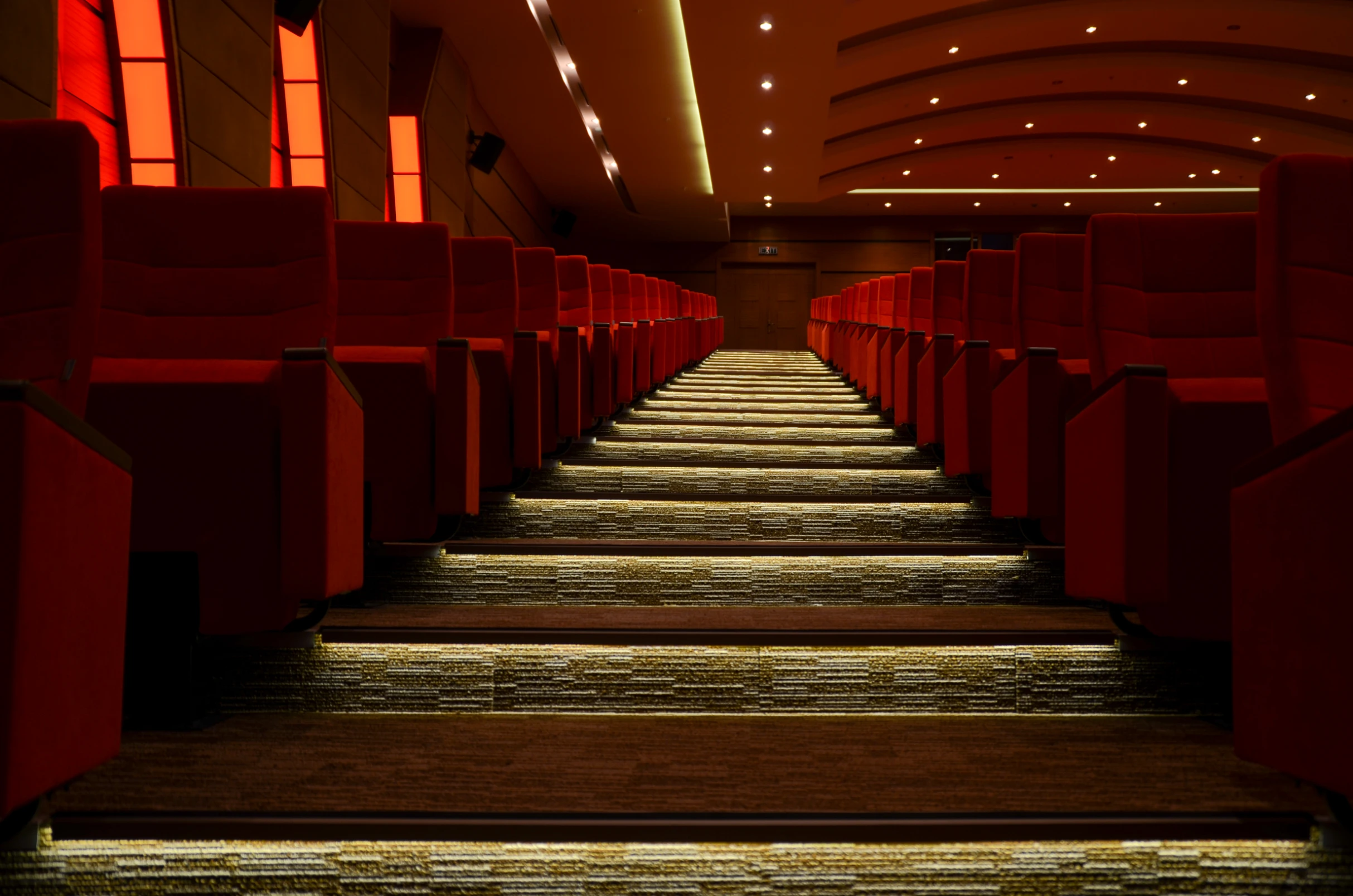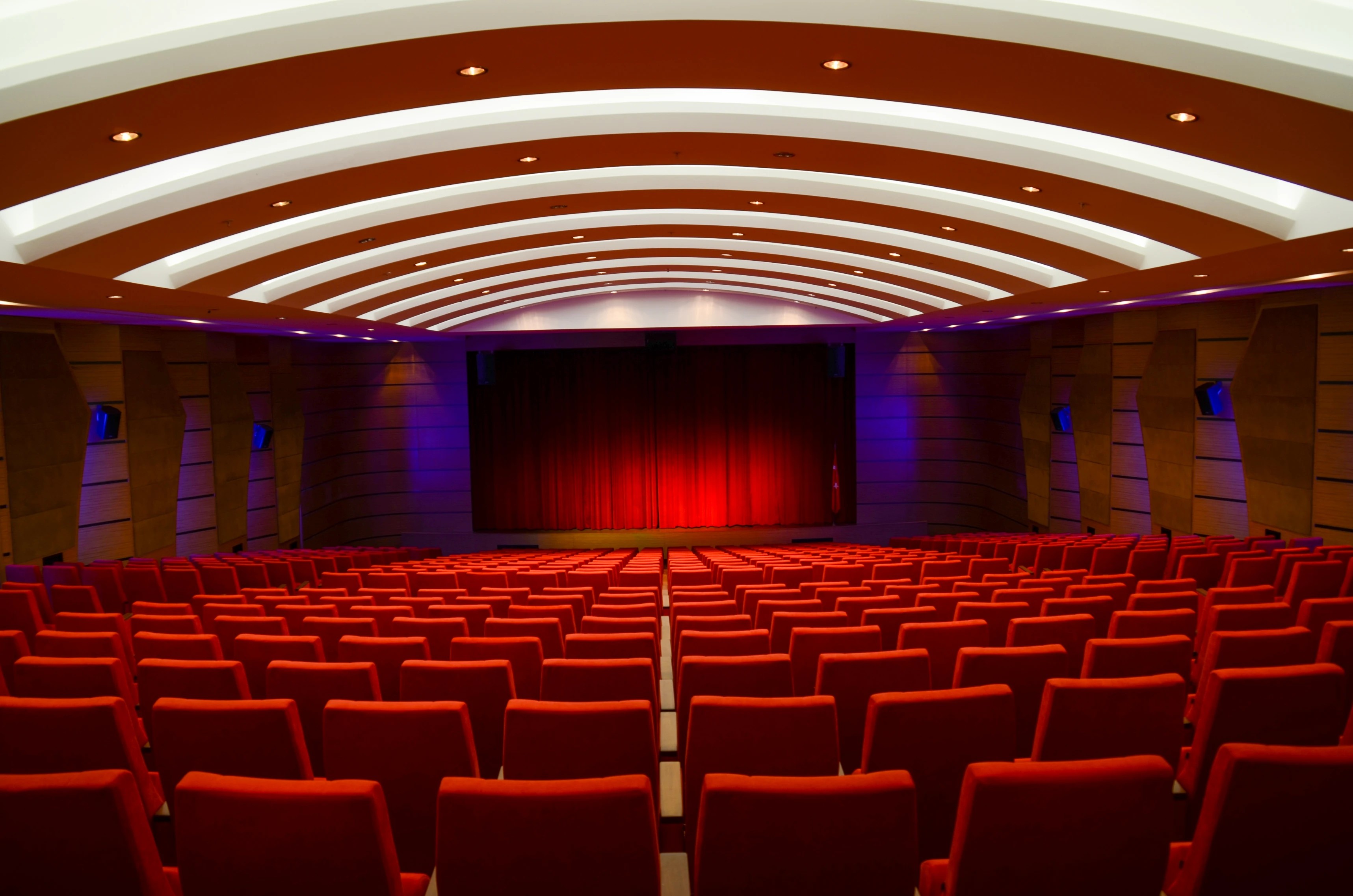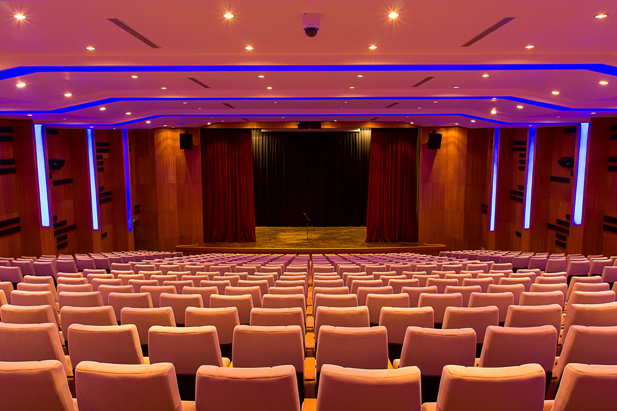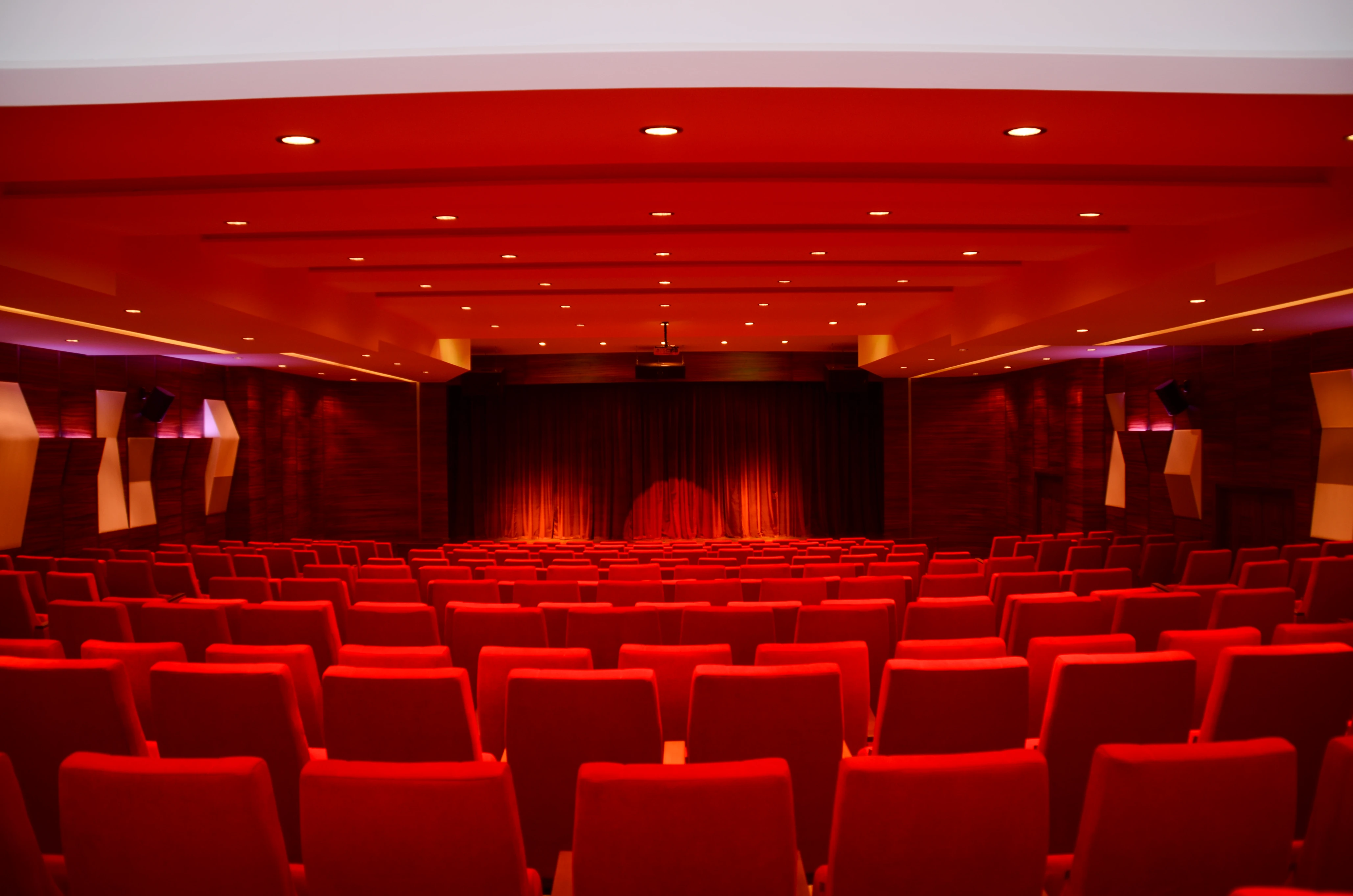 A 369-seat auditorium distinguished by its striking red palette and refined detailing. Custom acoustic panels with vertical wooden slats form a unique wall pattern, highlighted by concealed LED lighting that enhances depth and texture in dimmed settings. The hall integrates architectural precision with stage mechanics and professional AV systems, achieving both visual character and balanced acoustic performance.