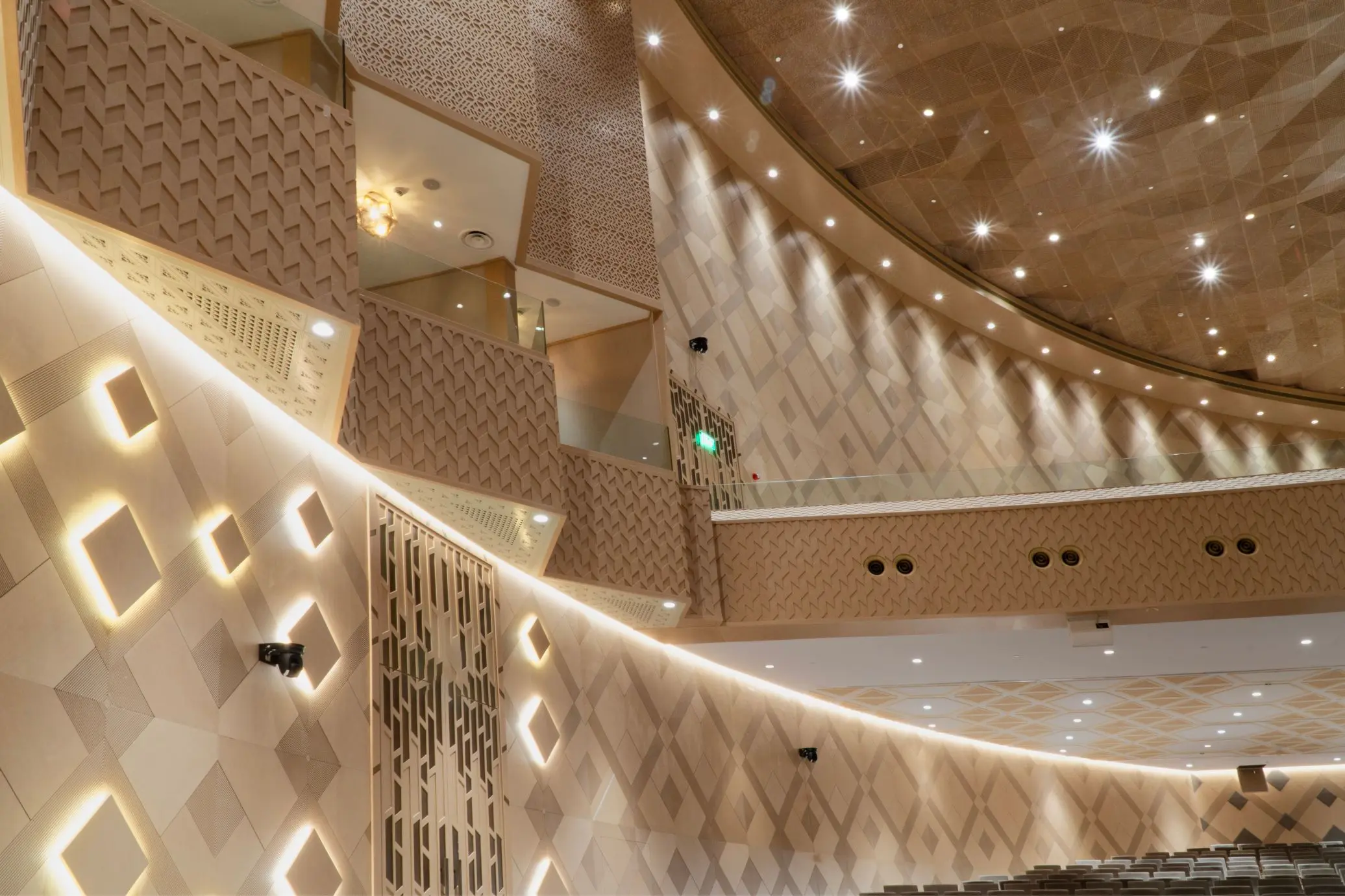 A 2,200-seat Performing Arts Hall within the King Abdulaziz Convention Center, designed with a fully bespoke architectural and acoustic approach. The space is defined by its warm geometric surfaces, premium A-class material selections, and carefully integrated lighting and sound systems that elevate both clarity and atmosphere. Every detail—from spatial form to acoustic treatment—works together to create a refined, high-performance venue worthy of large-scale cultural and academic events.