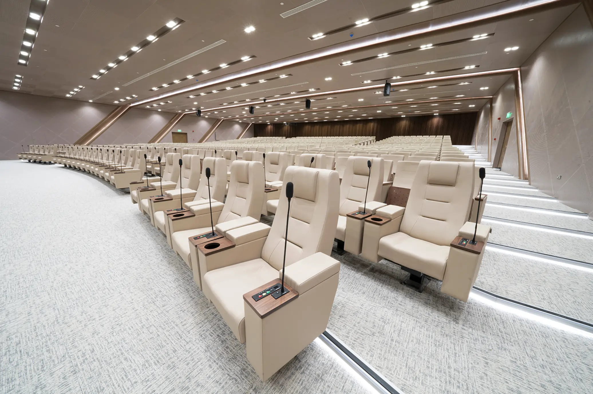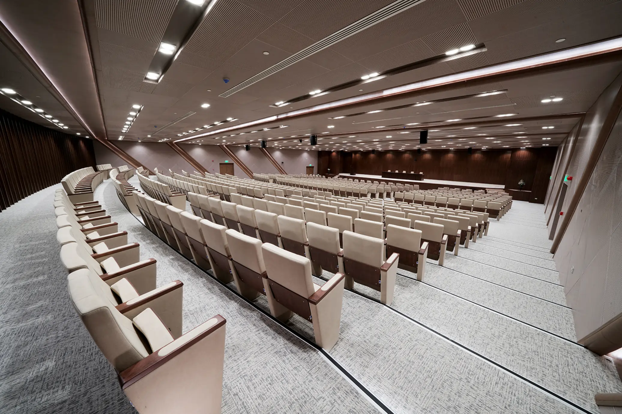 A 480-seat multi-purpose conference hall designed and executed with full architectural, acoustic, and audiovisual integration, featuring high-quality materials and dynamic LED lighting that enables diverse atmosphere scenarios.