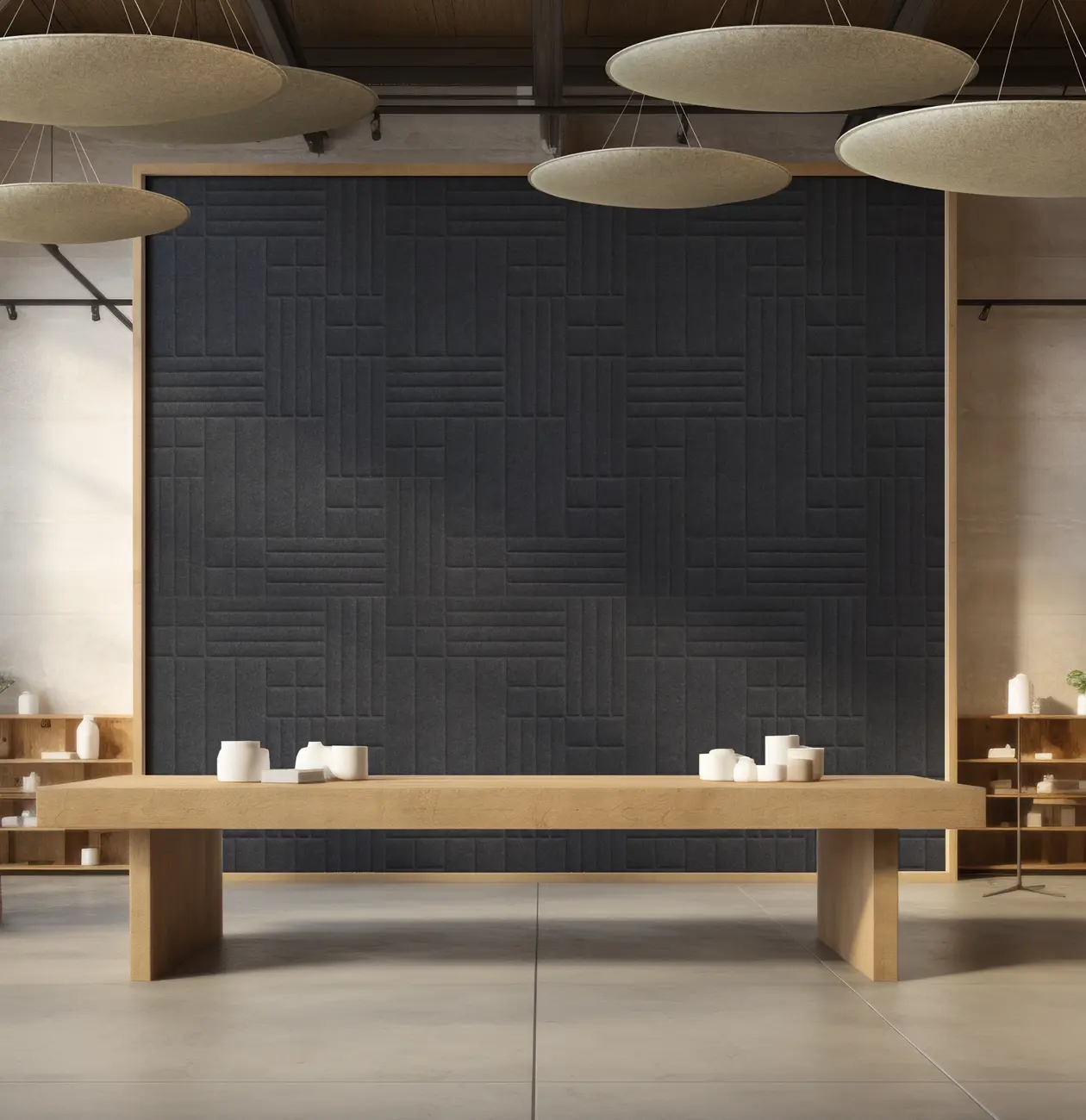 The simple yet cohesive geometry of the Plaid, Ridge, and Bold models allows for versatile use as focal points or backdrops in architectural solutions. This coordinated grouping enhances holistic aesthetic appeal, optimizing both visual and user experiences to create silent, functional, and visually appealing spaces.