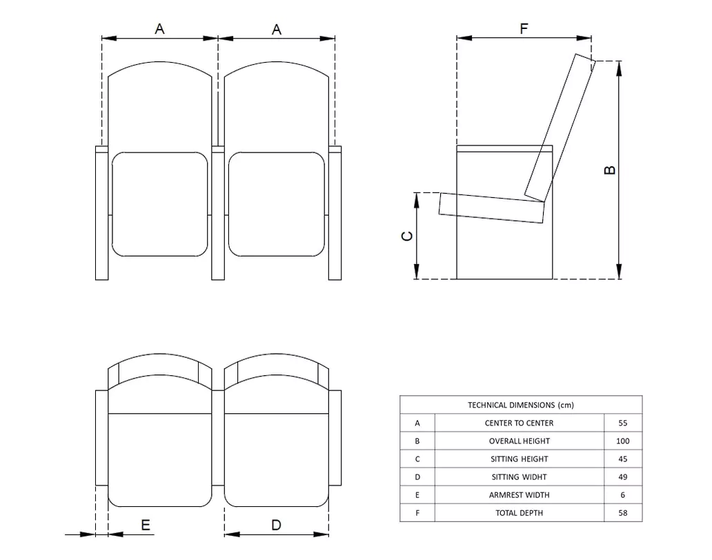 Customizable seat, back, arm, and cup holder dimensions to meet project specifications. Fire-retardant fabrics and leathers ensure safety compliance. Row and seat numbering available for easy organization.