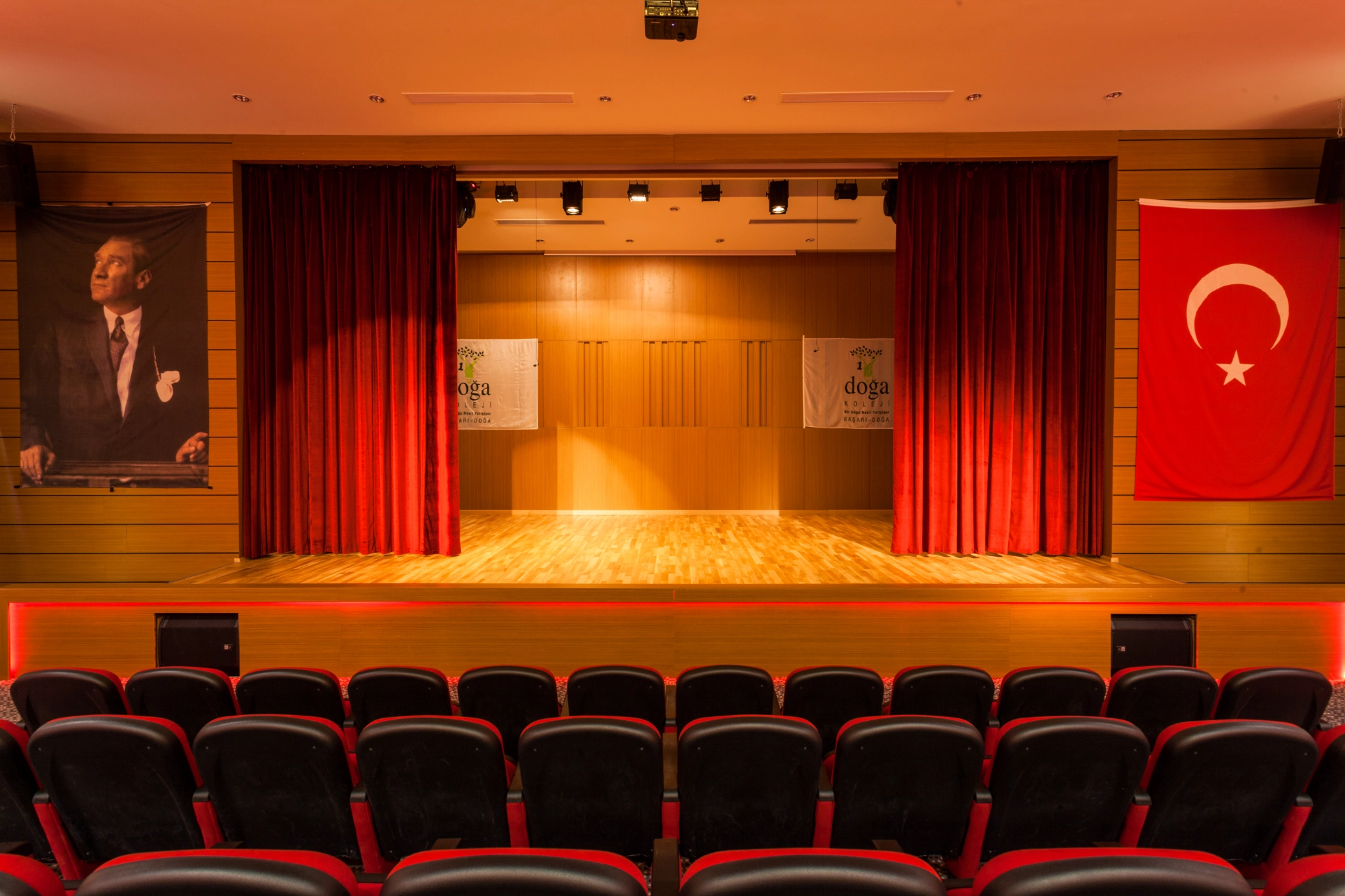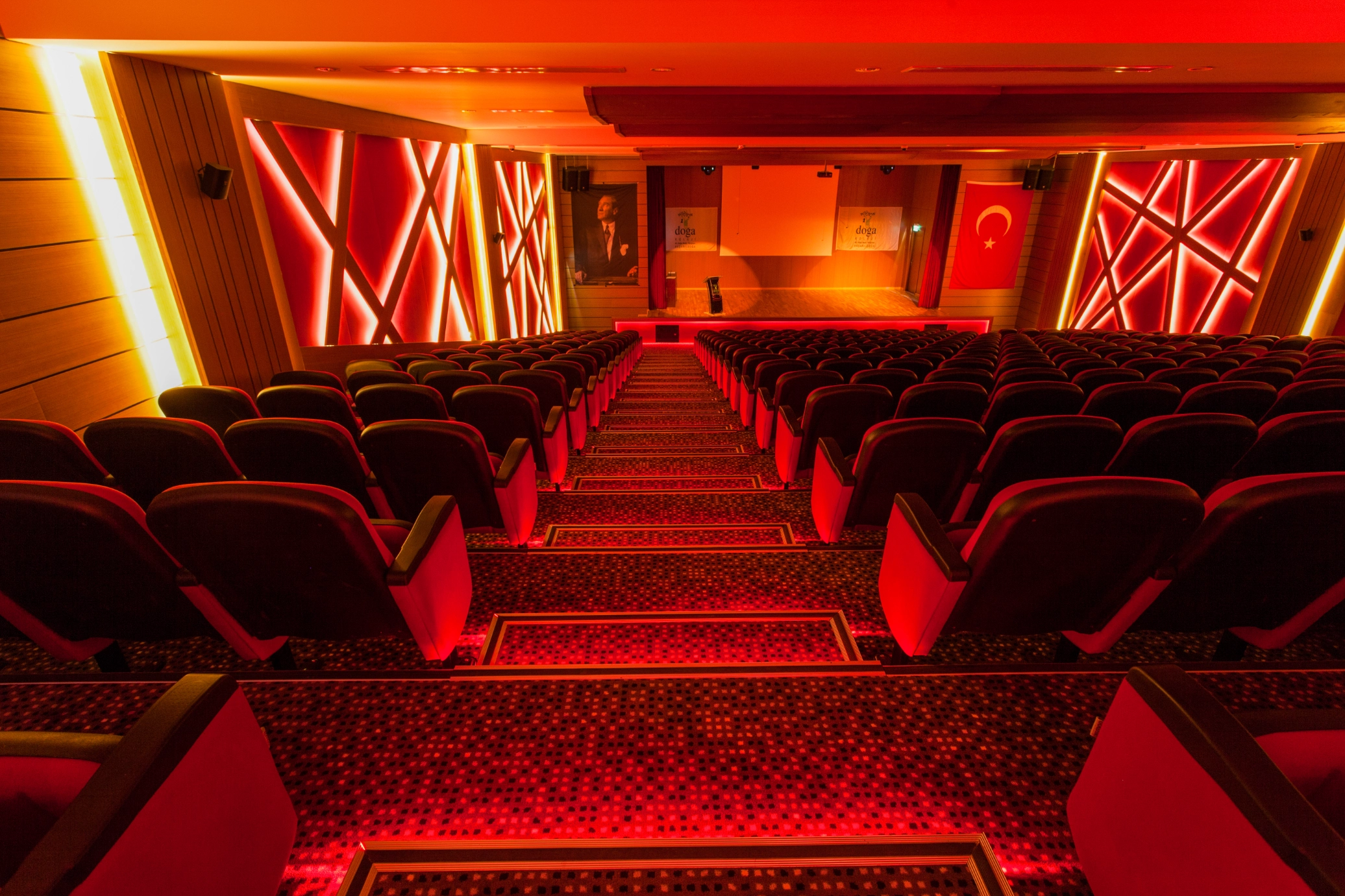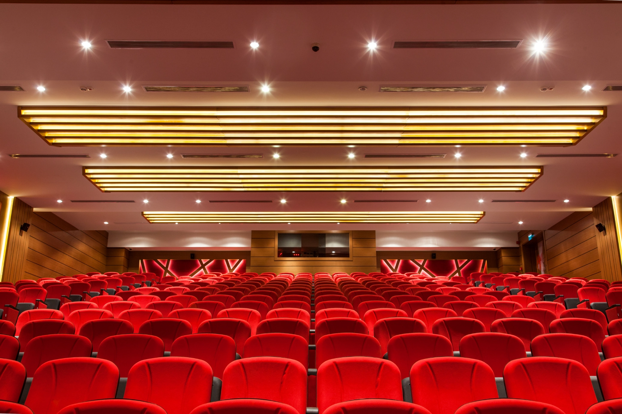 A 369-seat auditorium distinguished by its striking red palette and refined detailing. Custom acoustic panels with vertical wooden slats form a unique wall pattern, highlighted by concealed LED lighting that enhances depth and texture in dimmed settings. The hall integrates architectural precision with stage mechanics and professional AV systems, achieving both visual character and balanced acoustic performance.